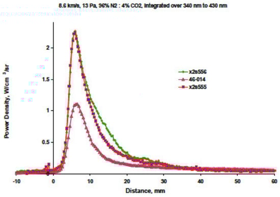 - Cruden, B.A.; Prabhu, D.K.; Brandis, A.M. Measurements and characterization of mid-wave infrared radiation in CO2 shocks, AIAA Paper 2014-2962. In Proceedings of the 11th Joint Thermophysics and Heat Transfer Conference, Atlanta, GA, USA, 16–20 June 2014. [Google Scholar]