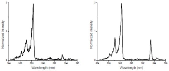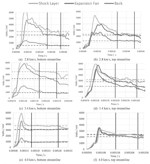 Several experimental studies have been focused on radiation measurements for Mars aerocapture and Venus entry conditions. Experimental campaigns for Venus entry have been carried out in EAST shock-tube by Martinez [1], and Cruden et al. [17,18]. The calibration of the deuterium lamp selected for the VUV measurements is detailed in [1]. In these studies, a 96.5 CO2 and 3.5 N2 atmosphere was considered for Venus, while a 96 CO2 and 4 N2 atmosphere was retained for investigating a Mars aerocapture in [1]. The different entry conditions investigated for VUV measurements related to Venus entry are resumed in Table 1. A comparison between the conditions tested in [17] and the some entry probe trajectories is shown in Figure 7. Experiments were performed from the VUV to IR ranges, from 120 up to 1700 nm at high velocities, in [1], and up to 5000 nm for low velocities, in [17,18].