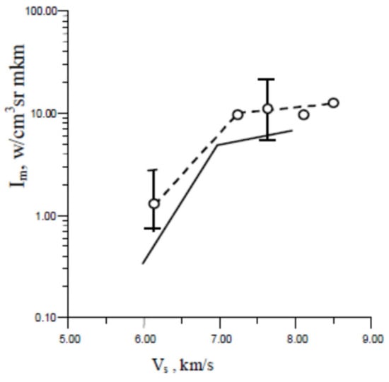- Dikalyuk, A.S.; Surzhikov, S.T.; Kozlov, P.V.; Shatalov, O.P.; Romanenko, Y.V. Nonequilibrium spectral radiation behind the shock waves in Martian and Earth atmospheres. In Proceedings of the 44th AIAA Thermophysics Conference, San Diego, CA, USA, 24–27 June 2013. [Google Scholar]