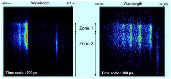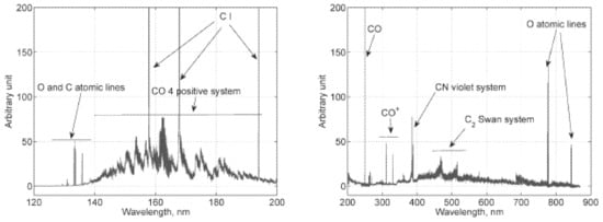 - Vacher, D.; Lino Da Silva, M.; André, P.; Faure, G.; Dudeck, M. Radiation from an equilibrium CO2-N2 plasma in the 250-850 nm spectral region: 1. Experiment. Plasma Sources Sci. Technol. 2008, 17, 035012. [Google Scholar] [CrossRef]