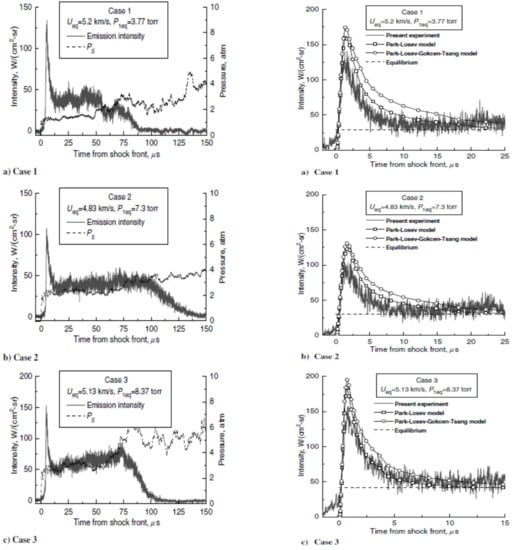 - McIntyre, T.J.; Eichmann, T.N.; Jacobs, C.; Potter, D.; McGilvray, M.; Jacobs, P.; Morgan, R. Shock tube and expansion tunnel measurements of high temperature radiating flows, ESA SP-689. In Proceedings of the 4th International Workshop on Radiation of High Temperature Gases in Atmospheric Entry, Lausanne, Switzerland, 12–15 October 2010. [Google Scholar]