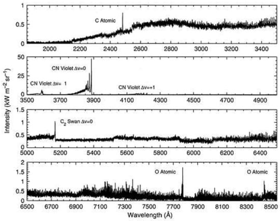 Emission spectrum for a Mars atmosphere (96% CO2, 4% N2) at 13.3 Pa and a shock velocity of 8.6 km/s (from [23]).