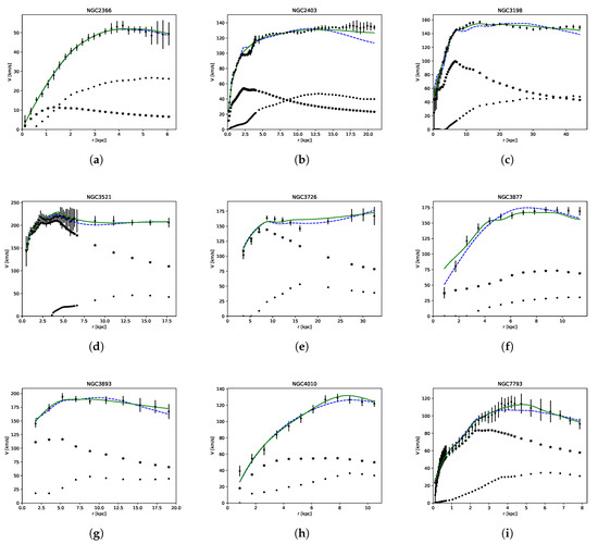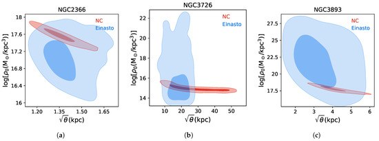 To improve a statistical comparison of both models, we use the corrected Akaike information criterion (AICc) [44,45,46] defined as and the Bayesian information criterion (BIC) [47] defined as . In the previous expressions, k is the size of the parameter space and N is the number of data points. The model with lower values of AICc and BIC is the one preferred by the data. In this context, the difference between the AICc value of a given model and the best one is denoted as . If , both models are supported by the data equally, if the data still support the given model but less than the preferred one. A value of indicates that the data does not support the given model. In contrast, ΔBIC gives the evidence against a candidate model over the best model, which is the one with lower BIC value. Then, a yield of suggests that there is no evidence against the candidate model. A value within indicates that there is modest evidence against the candidate model. A strong evidence against the candidate model happens when , and a stronger evidence against is whether . According to our AIC results shown in Table 3, the galaxies NGC2366, NGC3893, and NGC4010 prefer both models equally, the galaxies NGC3521, NGC3726, and NGC7793 prefer NC-like over Einasto, and the galaxy NGC3877 does not support Einasto. Only the galaxies NGC2403 and NGC3198 do not support NC-like. Based on BIC, our results indicate that the galaxies NGC3893 and NGC4010 do not suggest a evidence against any model. The galaxies NGC2366 and NGC3726 suggest a modest evidence against Einasto model but a strong evidence using NGC3521 and NGC3877. In contrast, the sample NGC7793 gives a modest evidence against NC but a stronger evidence is observed using NGC2403 and NGC3198.