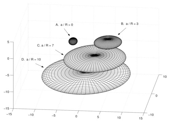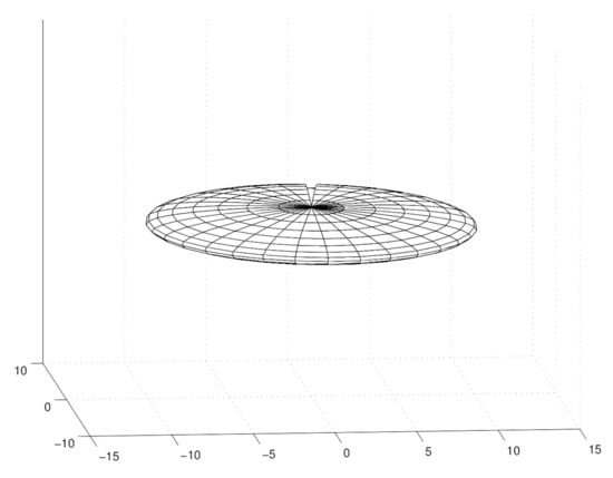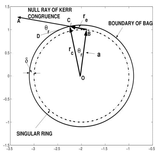 Therefore, the Kerr–Newman spin parameter a leads to a strong deformation of the shape of the bag model, and this deformation of the bag leads to the appearance of a relativistic string at the sharp edge of the KN disk (see Figure 4).