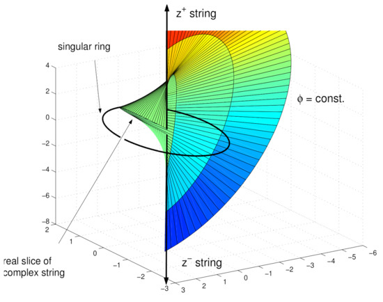 The Kerr–Newman solution demonstrates an intrinsic connection to string theory. The role of the string is played by the singular ring of the Kerr solution [12,13]. A regularized version of this string occurs at the sharp edge of the disk-like boundary of the ellipsoidal bag forming the regular source of the Kerr–Newman solution (see Figure 5).