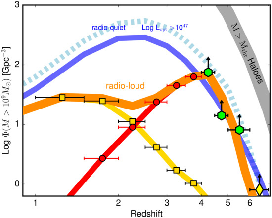 Comoving number density of active supermassive black holes with hosted in jetted (orange line) and non-jetted active galactic nuclei (AGNs) (blue line). The non-jetted density is derived from the luminosity function of radio-quiet quasars in the Sloan Digital Sky Survey (SDSS) [17], by assuming that all quasars with host black holes with masses we are interested in (following the assumptions considered by Ghisellini et al. [20] while extracting the same quantities from Hopkins et al. [22]). As a comparison, the light blue dashed line is the comoving number density derived from Hopkins et al. [22]. The jetted-related curve is instead formed by the sum of luminosity functions from Fermi/Large Area Telescope (LAT) (yellow line and points) and Swift/Burst Alert Telescope (BAT) (red line and points), up to . Green hexagonal lower limits are derived from the systematic classification of blazar candidates from SDSS and Faint Images of the Radio Sky at Twenty-Centimeters (FIRST), based on X-ray observations and corrected by the sky area covered by the survey. The yellow diamond lower limit refers to PSO J0309+27, the farthest blazar currently known.