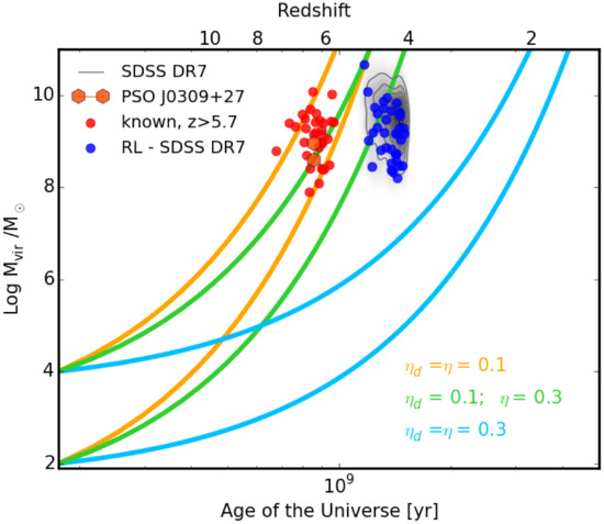 Black hole mass evolution as a function of the age of the Universe. Red points are the known quasars with virial-based mass measures at . The hexagons show the mass range of the highest-z blazar known [16]. The grey contours show the whole SDSS DR7 quasar sample, including the few tens of radio-loud sources (blue points). The solid lines show the Eddington-limited evolution based on the Salpeter timescale, starting from two different black hole seeds, and assuming that (i) the energy released during the accretion coincides with the accretion disc radiative efficiency in the case of a Shakura–Sunyaev disk around a non-spinning black hole (yellow line), (ii) same but in the case of a maximally spinning black hole (green line), (iii) the black hole is maximally spinning and thus the energy release is , but only a fraction of it is radiated through the accretion disc (light blue line).
