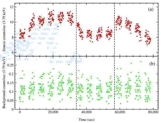 We processed the NuSTAR observation Id 90501317002 (https://heasarc.gsfc.nasa.gov/cgi-bin/W3Browse/w3browse.pl (accessed on 10 April 2019)) using the nupipeline command of NuSTAR Data Analysis Software (NuSTARDAS) version 1.8.0 (https://heasarc.gsfc.nasa.gov/docs/nustar/analysis/ (accessed on 10 April 2019)) and with the Calibration database (CALDB) version 1.0.2 (http://heasarc.gsfc.nasa.gov/FTP/caldb/data/nustar/fpm/ (accessed on 10 April 2019)). The spectra and light curves of the source were extracted from the FPMA detectors using a 60 circle centered at the position of XTE J1908+094. The background region was selected carefully, since the source could have contamination from the nearby bright source GRS 1915+105. The background was chosen as a 60 radius circle as far away from the XTE J1908+094. The background count rate is less than 2% of the source count rate, indicating that the source is still dominant. We also divided the total ∼40 ks data in three segments of ∼16 ks, ∼10 ks, and ∼12 ks for detailed study. We used XSELECT command filter time for this. The spectra and light curves were then generated using nuproducts. The spectra were re-binned to have 20 counts/s using grppha. The light curves were binned with 100 s time resolution.