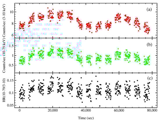 The variation of (a) 3–10 keV count rate, (b) 10–79 keV count rate, and (c) hardness ratio (HR) with time (in sec). The light curves are binned with a time resolution of 100 s.