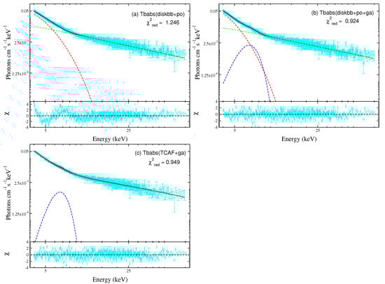 Unfolded spectra using (a) Tbabs(diskbb+powerlaw), (b) Tbabs(diskbb+powerlaw+Gaussian), and (c) Tbabs(TCAF+Gaussian) with their ratio. The red, green dashed lines are the blackbody and powerlaw model components. The solid black line refers to the combined best fitted spectra. The blue dashed lines are the Gaussian component.