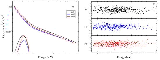 (a) Best-fitted spectra for the three segments of the NuSTAR observation. The right panel (b) shows the (i.e., (data − model)/error) variations of the three spectra in respective colors.