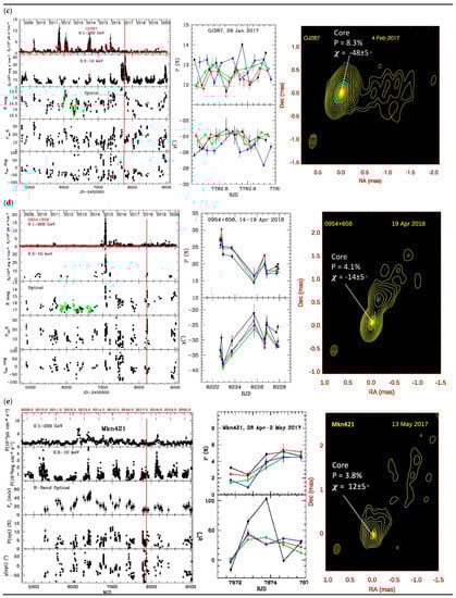 - Williamson, K.E.; Jorstad, S.G.; Marscher, A.P.; Larionov, V.M.; Smith, P.S.; Agudo, I.; Arkharov, A.A.; Blinov, D.A.; Casadio, C.; Efimova, N.V.; et al. Comprehensive Monitoring of Gamma-ray Bright Blazars: Statistical Study of Optical, X-ray, and Gamma-ray Spectral Slopes. Astrophys. J. 2014, 789, 135. [Google Scholar] [CrossRef]