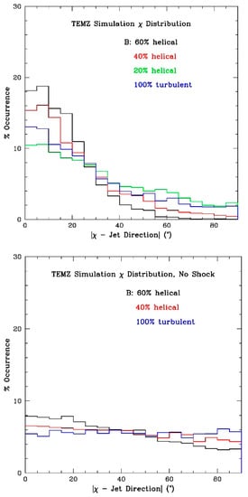 - A helical magnetic field tends to produce LP with χ oriented either parallel or perpendicular to the jet axis [16]. An off-axis emission feature (e.g., a slow magnetosonic shock) can cause rotation of χ by >180° as it spirals down the helical field pattern, whose field lines propagate at nearly the speed of light [17]. Unless the twist of the helical field reverses, such rotations should always be in the same sense (e.g., clockwise).