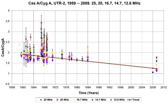 After the inclusion of observational data from 2009, the value of the rate of flux secular decrease according to the measurements of the Cas A/Cyg A flux ratios during one observation session in the decameter wavelength range was estimated as (0.81 ± 0.04) % per year at all investigated frequencies. Example plots of the Cas A observations (12.6, 14.7, 16.7, 20, 25 MHz) on the UTR-2 antenna are shown in Figure 1. Based on the results of measurements on sections of the GURT radio telescope (phased antenna array with the frequency range 10–80 MHz, Ukraine), the frequency of intersection of the Cas A and Cyg A spectra for the epoch 2014 was established. It is 45 ± 5 MHz. According to work [], the intersection frequency has shifted towards lower frequencies. Returning to Figure 1, it can be seen that the trend line has a slope of the secular decrease in the Cas A flux only taking into account the points of 2009, but before that, for almost 25 years, the Cas A radio flux decreased very weakly and the trend of the secular flux decrease is very weak, and is only better visible at 25 MHz. Linear trend parameters are shown in Table 1. It should be noted here that in this example, and further in the text of the article, all approximations are performed using the least-squares method.