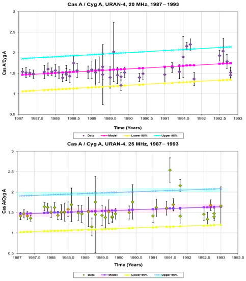 During the period of use of analog recordings from 1987 to 1992, observations were carried out in separate monthly sessions of 10–12 days at frequencies 20 and 25 MHz. After use of digital recording (since 1998), observations were carried out continuously, with the exception for the time of VLBI observation sessions and technical maintenance periods. As a result of data processing, the average values of the Cas A/Cyg A flux ratios were obtained for a session or month of observations. Such an extensive observational material allows to trace in detail the presence of various factors affecting to observations of radio sources in the decameter radio range, including seasonal–diurnal effects and manifestations of solar and geomagnetic activity in terms of their influence to the ionosphere []. Based on the results of observation data at frequencies 20 and 25 MHz, it was found that for a correct consideration, changes in the ratio of flux densities Cas A/Cyg A are best divided into two data sets (examples in Figure 2 and Figure 3). Observational data are in Appendix A, Table A1 and Table A2. Observations from 1987 to 1993 were assigned to the first array.