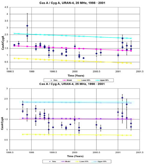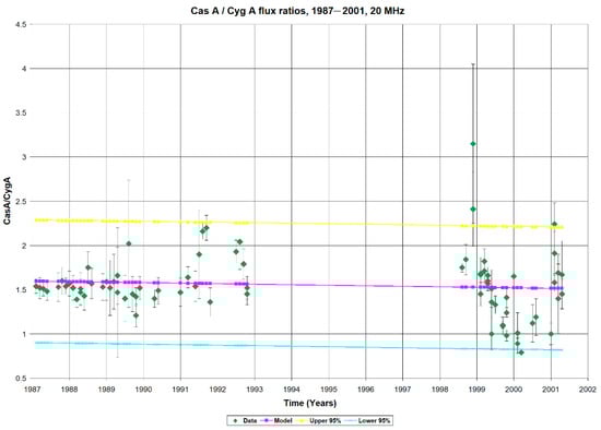In work [], the results of fifty-year observations of Cas A radio emission at frequencies 12.6, 14.7, 16.7, 20 and 25 MHz on the UTR-2 radio telescope (one of the world’s largest T-shaped phased array with a frequency range 10–30 MHz, IRA NASU, Ukraine) have been analyzed. In the period from 1959 to 1990, observations were carried out at the same time of the year (winter period), which made it possible to exclude the influence of the seasonal–diurnal effect. During this period, the effect of secular flux decrease did not manifest itself against the background of large fluctuations in the Cas A/Cyg A flux ratio, and from 1966 to 1969 the Cas A flux even sharply and systematically increased at all five frequencies of the decameter radio range.