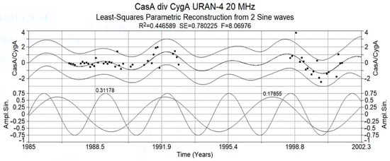 The state of the ionosphere associated with seasonal–diurnal effects, as well as solar and geomagnetic activity, has a significant effect on the variations of the Cas A and Cyg A fluxes, and under the influence of external factors, fluxes change slightly different for each radio source, the Cas A and the Cyg A, which further increases the scatter of the points of the Cas A/Cyg A flux density ratio. Usually, sudden and sharp increase energy of ultraviolet and X-ray emission from the Sun at the beginning of the flare reaches the Earth and causes additional ionization of the ionospheric layers at heights about 75 km (layer D) and 110 km (layer E). This leads to the fact that the absorption of radio waves increases in the part of the Earth, illuminated by the Sun, especially in the low-frequency range. Even in the mid-latitude region, ionospheric effects have a strong influence on the receiving of signals from powerful space sources. Thus, the secular decrease of the Cas A flux at decameter wavelength is weakly manifested against the background of seasonal and diurnal factors and changes of the state of solar and geomagnetic activity. Further, an attempt was made to approximate the observational data with a trigonometric polynomial inscribed in the series of observations at frequencies of 20 and 25 MHz from 1987 to 2001. The quality of the obtained approximation turned out to be much better, an example for a frequency of 20 MHz is shown in Figure 5.