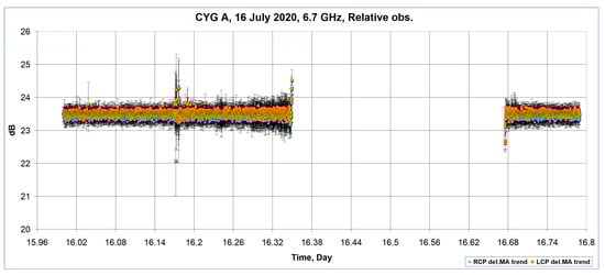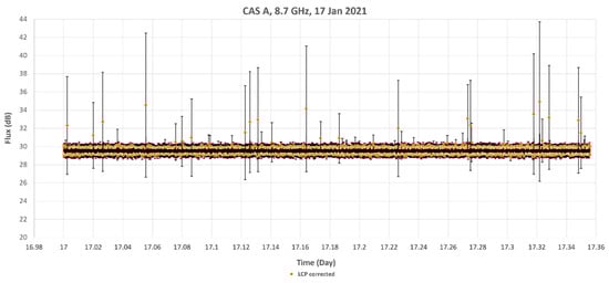 Further, for comparison, consider the series of Cas A observations, from 11 June 2020 to 19 June 2020, carried out at close frequencies 8.6 and 8.7 GHz, in the Jansky flux density measurement mode. An example of 8.6 GHz recordings is shown in Figure 8. For this example, the flux density standard deviations for left (LCP) and right (RCP) circular polarizations are shown in Table 5.