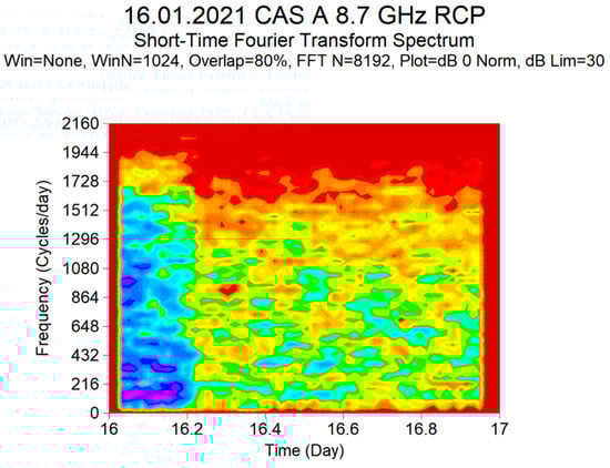 After removing the “outliers” points of the radio interference, analysis for check “normal distribution” of the data was performed using the modified Kolmogorov and Smirnov criteria, as well as the Cramer–Mises, Anderson–Darling, asymmetry and kurtosis criteria [,]. This analysis showed that the data is not normally distributed, that is, it is not purely noisy. Additionally, to reduce noise, smoothing was applied using the Savitzky–Golay filter, with the following parameters: anti-aliasing window half-width—10 points, polynomial degree—4, number of passes—3 []. Further, periodograms were constructed using the Lomb–Scargle method for uneven time series of the analyzed data for 15–17 January 2021, with confidence intervals showing the significance of the peaks on periodograms. As a result, analyzed data showed the presence of quasi-cyclic components with a time scale of variations ranging from about 4 min to 30 s. Figure 7 shows an example of signal spectrogram at 8.7 GHz for 16 January 2021 data in right circular polarization (RCP), with a wider spectrum of variations.
