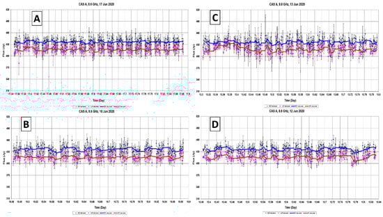 The Cas A flux density records at 8.6 GHz. (A) 17 June (B) 18 June (C) 13 June (D) 12 June 2020. It can be seen that the Cas A source is stable in time; however, there are small deviations from the mean value in the form of fast variations in the flux density.