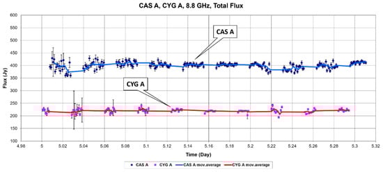 For the specified observation interval, at a frequency of 8.6 GHz, the averaged (in two circular polarizations, left and right) total Cas A flux density was 426.71 ± 10 Jy. Measurements published in 1967 at 8.25 GHz showed a flux density of 620 Jy []. According to work [] calculated secular decrease in the Cas A flux density, for the 2000 epoch, the flux at 8.25 GHz should have decreased to 497 Jy. The secular flux decrease is reported as 0.55% per year at 8.25 GHz. Subsequently, observations of the Cas A and Cyg A radio sources were carried out at a frequency of 8.8 GHz on 4–5 February 2021. The average total flux of Cas A in two days turned out to be 407.12 ± 7 Jy and the average flux of Cyg A, over the same time interval, turned out to be 237.55 ± 6 Jy. Thus, at centimeter wavelength, the flux density of Cas A noticeably exceeds the flux density of the radio galaxy Cyg A, (the ratio between mean flux Cas A/Cyg A ≈ 1.71 at a frequency of 8.8 GHz) despite the presence of a systematic secular decrease in flux density. The current state of separation between the Cas A and Cyg A flux densities is shown in Figure 9. Further, the observational data (3 days) at a frequency of 6.7 GHz, obtained at VIRAC in May 2020, were analyzed. The average value of the Cas A flux density at this frequency was 460 ± 9 Jy. At a very close frequency of 6.6 GHz (measurements were made in 1965), the Cas A flux decreased from 684 Jy (1965) to 548 Jy (2000), that is, by 136 Jy in 35 years or by 0.57% per year. Taking into account the observations of 2020, at a frequency of 6.7 GHz, the Cas A flux density decreased from 548 Jy (2000) to 460 Jy (2020), that is, by 88 Jy over 20 years or by 0.8% per year (relative to measurement in 2000), which is the rate of decrease is slightly larger than earlier published data []. Monitoring of the Cas A and Cyg A fluxes on VIRAC radio telescopes will continue with the expansion of the frequency range and conducting measurement sessions throughout the year.