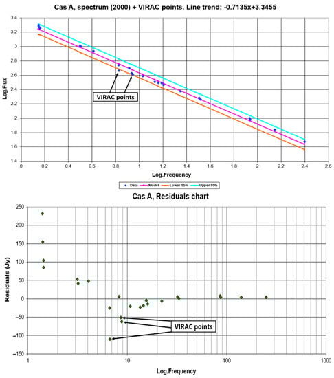 At the same time, for accurate precision measurements of the Cas A flux, the observation time interval of 10 days is very small, since the measurements can occasionally be distorted by random atmospheric or radio interference. For more accurate measurements, observations are needed in different seasons of the year and at different states of solar activity. Nevertheless, the main trend of the secular decrease in the Cas A flux density is clearly manifested. To visualize the degree of change in the Cas A radio spectrum, tabular data for the 2000 epoch were taken from the article []. Added to them, are results of measurements of the Cas A flux density performed in VIRAC at frequencies 6.7, 8.6 and 8.8 GHz. Next, a linear regression was performed (with 95% confidence levels), in logarithmic coordinates. This shows that the VIRAC measurements at 8.6 and 8.8 GHz are approximately at the lower 95% confidence level, while the 6.7 GHz measurement is slightly below 95% level. Thus, in general, the secular decrease in the flux of Cas A as measured in 2020 and 2021 is located near the statistical boundaries, without an anomalous decrease, but nevertheless, the drop in flux over 20 years turned out to be notable, which is shown by the graph of residuals (Figure 10) after subtracting the linear trend (residuals are recalculated in Jy taking into account that ). Linear regression parameters are shown in Table 6.