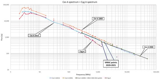 For greater clarity, we have placed on one plot (Figure 11), spectra of the Cas A source from literature (combined and described in the article []), for different observation epochs—1965, 2000, 2015 plus observation points obtained in VIRAC. We also added the spectrum of the radio galaxy Cyg A [], in order to see the ratio of Cas A and Cyg A flux densities for different observation epochs (because the flux of the radio source Cyg A practically does not change over time for many years and in a wide frequency range, it is very stable). The second intersection spectra of the Cas A and Cyg A sources occurs at a frequency of about 1 GHz. This is due to the secular decrease in the Cas A flux, because in 1965 the Cas A flux was higher than the Cyg A flux, and the entire radio spectrum of Cyg A was below the Cas A radio spectrum. Over time, the Cas A flux decreased and the spectrum “dropped” relatively stable spectrum of Cyg A, which led to a double intersection of the convex part of the radio spectrum of Cyg A, at two points.