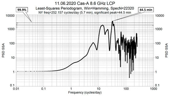 According to observations made at VIRAC, weak flux density variations were present during one week of observations. To estimate the characteristic times and features of these variations (cyclical or irregular), periodograms were constructed for irregular time series. An example is shown in Figure 12.
