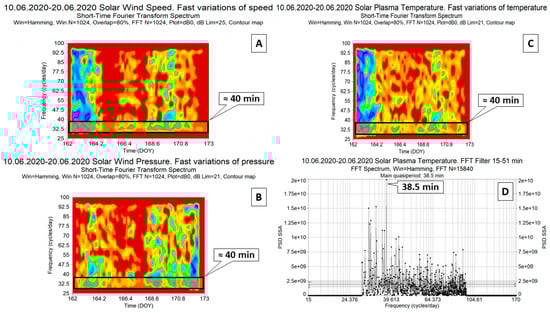 To calculate the time–frequency spectrograms of the Cas A data and solar wind parameters data, the classical Short-Time Fourier Transform (STFT) method was used, which is quite common in radio astronomy and is described in many articles, for example, in [].