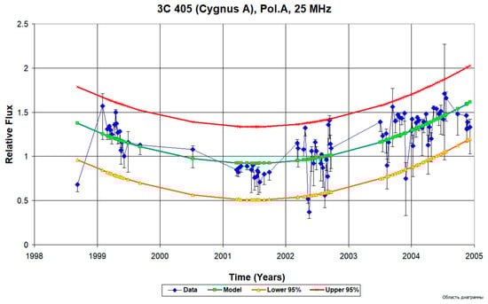 (observation period 1949–2008.9), as well as (observation period 1966.5–2006.6), and (observation period 1978.8–2011.7). Analysis of long-term observations at 38 MHz [,] demonstrated significant flux variations relative to the monotonic trend of the secular decrease in the Cas A flux density. Such effects require separate studies. A large piece of work for the study of variations in secular decrease the Cas A flux was carried out at the VLA antenna system in the USA. In work [], the analysis of data over a period of about 15 years, performed mainly at the frequency 74 MHz, is considered. It is known that the Cas A flux density, against a background of secular decrease trend, has variations that have been mentioned by many authors. In the work performed at the VLA, it was shown that, in fact, there are near-cyclic variations in the flux density Cas A, with quasi-periods 3.1, 5.1, 9.0 and 24.0 years. The nature of these long-term variations is not yet fully understood and is under discussion. Therefore, continuous monitoring of Cas A at low frequencies is an important scientific task.