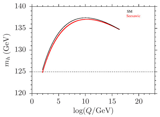 To elucidate the meaning and effects of the naturally coupled DS; it proves convenient to study its certain salient features. The first point to study would be naturalness condition (43) under the renormalization group flow of the model parameters. This is important because the Higgs boson mass mast be kept stable under the logarithmic contributions in (44). Depicted in Figure 3 are the scale dependencies of the Higgs boson mass from the electroweak scale up to the GUT scale in the SM (black curve) and in the SM + DS (red curve). In here, the DS is represented by a singlet scalar such that SM–DS coupling obeys the seesawic bound in (43) at the GUT scale. It thus follows that naturally coupled dark sectors do indeed not disrupt the stability of the electroweak scale [38].