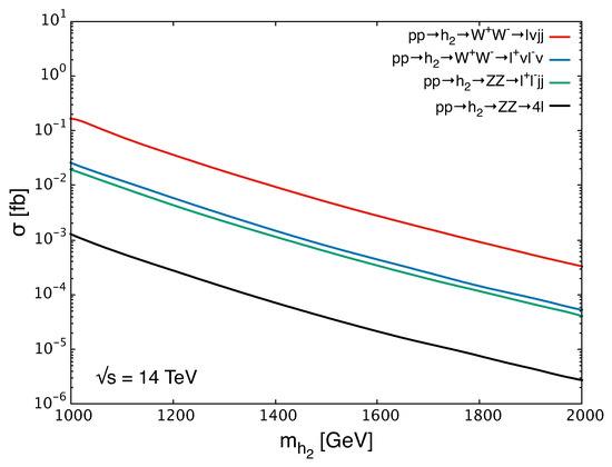 To refine the the approximate analysis above, production of at the LHC can be studied via its mixing with the SM Higgs field as in (44) under the naturalness bound in (43). In this regard, production cross sections for a set of final states are plotted in Figure 5 in which is the heavy mix of the H and . It is clear that cross sections fall with in accordance with the naturalness bound in (43). It is with higher and higher luminosities that a collider can access heavier and heavier particles [39].