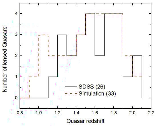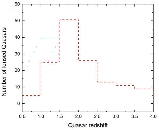 In Figure 3, the obtained redshift distribution of the lensed Quasars is shown. As one can see, the redshift distribution peaks for redshift values in the range 1.5–2 and becomes almost flat for Quasar redshifts larger than about 2.5.