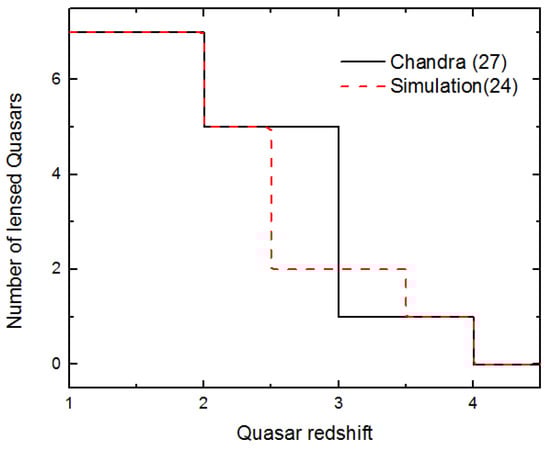 We simulate the same conditions inside our code and find 24 synthetic lensed Quasars with the image separation higher than arcsec. In Figure 2, we show the histogram of redshift distributions for 27 Lensed Quasars that were observed by Chandra and 24 synthetic lensed Quasars simulated numerically. One can remark a good match in all bins of the Quasar redshift.