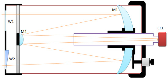 Optical scheme of the DIMM. M1-main optical mirror, M2-secondary hyperbolic mirror, W1-first slit, W2-second prismatic slit.