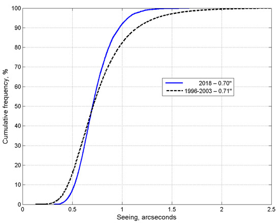 Cumulative distribution of astronomical seeing for the period August–November, 2018 and from 1996 to 2003.
