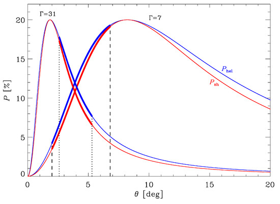 where, because of relativistic aberration the viewing angle in the rest frame, transforms into the angle in the observer’s frame according to the equation . Equation (2) is a reformulation of the expression derived by Hughes et al. [34] for the degree of polarisation resulting after an initially random magnetic field is compressed by a shock.