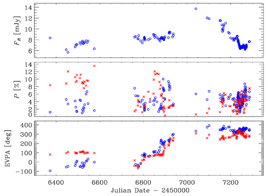 The blazar synchrotron emission detected from radio to optical–UV bands is linearly polarised, with variable polarisation degree P and electric vector position angle EVPA [9]. The behaviour of P, which is observed to reach values as high as ≥50% in the optical, is sometimes found to correlate with the flux, increasing with the source brightness, but often it does not. The radio and optical EVPAs can show large rotations [10,11,12,13,14,15,16,17,18] not necessarily linked to particular flux states or events. Indeed, large rotations can also be obtained from stochastic processes like turbulence, including many plasma cells with the random orientation of the magnetic field [17,19,20,21]. Moreover, it was shown by [22] that when changes of the jet orientation occur, variations of P and EVPA may look stochastic even if they are produced by deterministic processes. This makes the understanding of the physical scenario more challenging.