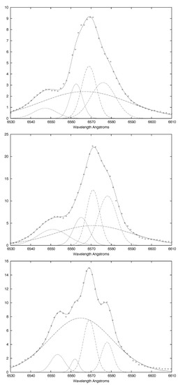 Three spectra of Hα taken from [9], after the onset of flaring. The lowest panel is for day + 291, the middle for + 294 and the uppermost + 297. Each is decomposed into five gaussian components, with intensities normalised to the continuum, see Figure 3. The two outermost are flare, the broad central component wind and the remaining pair originate in the circumbinary disk. Day + 294 was an eclipse day; both the blue and the red flares are substantial, having roughly twice the normalised intensity.