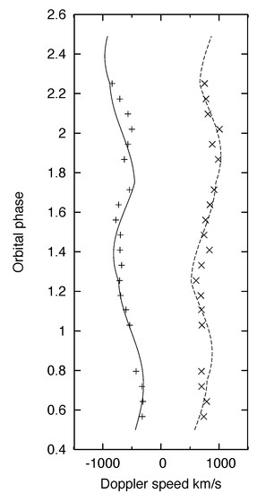 The Doppler shifts of the blue and the red flare components as orbital phase advances (from [9]). This pattern reveals a distinct memory of orbital phase. The superimposed curves assume a source in an accretion disk; the memory could also be caused by expulsion of plasma (see text).