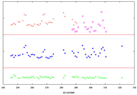 In the first instance, I concentrated on the absence of any eclipses of the red and blue flare components. The data of [13] cover eclipses of the compact object at approximately, days + 254, 268 and 281 before the flare and then days + 294 and 307, well after the onset of the flaring activity. The orbital phases (according to the Goranskii ephemeris) of the spectra closest to eclipse are, respectively, 0.97, 0.04, 0.035, 0.03 and 0.02.