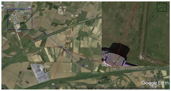 Figure 10 the map of the vicinity of the Virgo detector with directions of waves propagation is shown. Red lines is an assumed coordination system, shifted