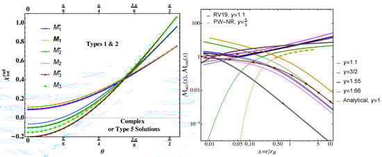 (Left) Angular dependence of the UV emission for models and . The horizontal black solid line at mark the transition from type 5 to types 1 and 2 solutions. (Right) Mach number as a function of radius for model and (analytical solution; orange curves), (numerical solution from [] with ; gray curves, and this work with ; green curves), (blue curves), (black curves), (magenta curves) and (non-radiative (NR), with ; red curves). The thick solid curves represent supersonic inflow () and outflow () solutions, while the dashed lines represent inflow and ourflow subsonic solutions.