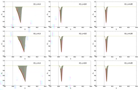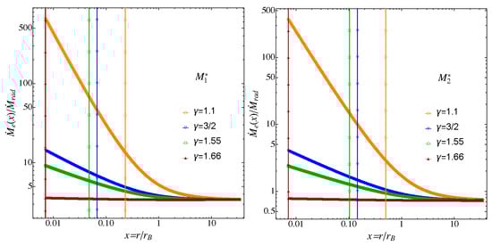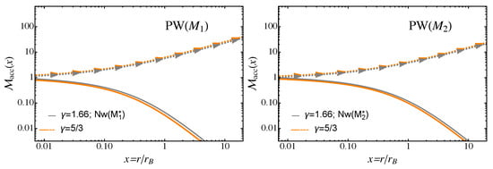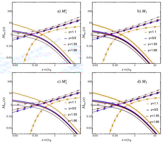 The bottom panel of Figure 2 shows the dependence of the Mach number of the inflow and outflow transonic solutions with the normalized radial distance from the black hole for model and various characteristic values of the adiabatic index, namely (full analytical solution; orange curves), (numerical solution from [] with ; gray curves, and this paper with ; green curves), (blue curves), (black curves), (magenta curves), and (red curves). Note that the latter curves correspond to the PW model with no radiation, i.e., with . The intersection of curves of the same colour define the position of the sonic point (). The thick solid curves for represent supersonic inflow solutions, while those at larger radii (i.e., ) represent supersonic outflow solutions. The dashed curves at radii are subsonic inflow solutions and those for are subsonic outflow solutions. The Mach number profiles are shown up to radial distances of ≈ from the centre. It is evident from this figure that isothermal () inflow occurs at slightly higher values of than its non-isothermal counterparts. As the adiabatic index is increased the accretion rate occurs at relatively smaller values of the Mach number everywhere and closer to the central source so that the region of supersonic accretion involves progressively smaller central volumes as increases. In contrast, the isothermal outflow takes place at much lower Mach numbers compared to the non-isothermal cases. These differences are clearly expected to influence the rates for non-isothermal accretion. As the adiabatic index is increased above the outflow close to becomes supersonic only when and keeps subsonic for all values <1.66. In the interval , the outflow proceeds supersonically for all non-isothermal cases () with a small dependence of the Mach number on , while towards larger x(≳0.2) the outflow becomes more supersonic as the adiabatic index is increased.