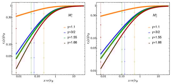 (Left) Estimated Bondi radii for model with . (Right with ), and for varied values of the adiabatic index in the range . The vertical solid lines mark the position of the sonic point and the symbols on them identify to which inflow solution they correspond to.