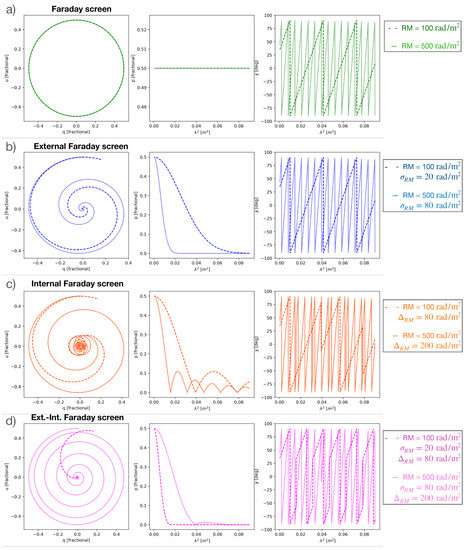 Representation of de/polarization models: (a) Equation (6), Faraday rotation (only one Faraday component does not depolarize the emission); (b) Equation (7), External Faraday depolarization (considering turbulent magnetic field); (c) Equation (9), Internal Faraday depolarization (considering regular magnetic field, only); (d) Equation (11), Mixture of Internal and External Faraday depolarization. Comparison between the behaviors of low and large RM values and low and large and are represented by dashed and straight lines, respectively. The used values of RM, and , are reported in the labels on the right side of the plots.