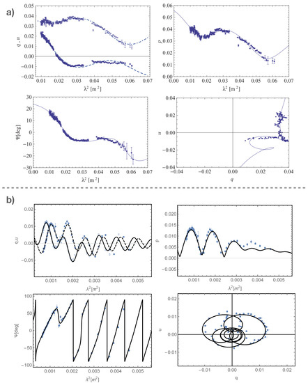 Depolarization Stokes QU-fitting on the sources: (a) PKSB1039-47 and (b) 0958+3224. The four panels represent: the Stokes parameters q, u (top left), the fractional polarization p (top right), the polarized angle [deg] (bottom left) all versus wavelength squared [m] and the Stokes u versus Stokes q (bottom right). Straight lines are the resulting model fit. Both sources have been fitted with three internal Faraday screens (Equation (10)). Images adapted from [18,33].