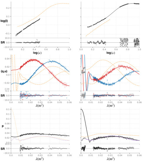Although early analyses performing model fit on sparse narrow-band fractional polarization and polarization angle (using the traditional linear fit of versus ) radio data, are present in the literature, (e.g., [26,39,40,41]), the first call of attention about the importance of fitting the Stokes Q and U in broad domain was made by [17]. They presented a polarization analysis of 585 compact radio sources observed with the WSRT at 350 MHz. On some of the sources, they performed different analyses: the traditional linear fit, the Stokes QU-fitting and the RM Synthesis techniques. They fit the sources using two simple depolarization scenarios: a foreground screen and two interfering RM components. They found that, although a single representative RM may be found using all the model fitting techniques, the Faraday structure of the sources is not always adequately represented. They stressed the importance of considering both the degree and the angle of polarization (or equivalently, q and u) over a range of as wide as possible, in order to obtain a more global picture of the polarization behavior. They favour QU-fitting as the technique which allows a more accurate description of the Faraday structure/s.