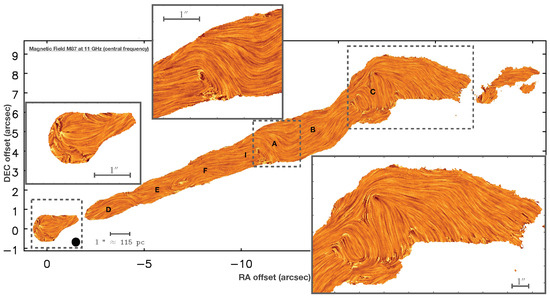 - Capetti, A.; Macchetto, F.D.; Sparks, W.B.; Biretta, J.A. HST polarization observations of the jet of M87. Astron. Astrophys. 1997, 317, 637–645. [Google Scholar]