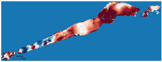 In this case, the radiation coming from the most distant part of the region with respect to the observer suffers a different amount of Faraday rotation (in this case is a parameter whose value is to be estimated) with respect to the radiation coming from the nearest part of that region. Therefore, this equation also embraces the scenario in which a smooth change in the Faraday depth occurs within a source. Here, the Faraday depth assumes the form of a simple RM, which produces a gradient of RM (RM) across the telescope beam [25,35]. Equation (9) becomes: